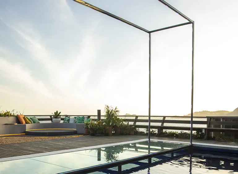 Estruturas 100% de alumínio, telhas termoacústicas, vidros laminados incolor com rejeição de calor que retém 76% do IR e 99% dos raios UV.