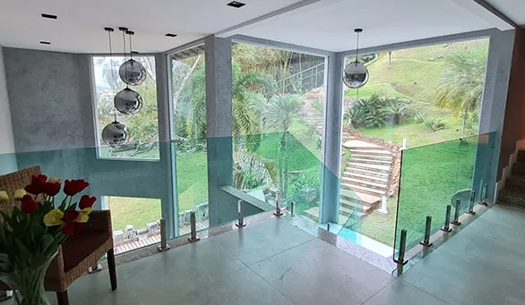 Credenciado pela Guardian e Blindex, estrutura de torres ou Botons de inox. Linha Infiniti de embuttir ou sobrepor e vidros laminados e temperados.
